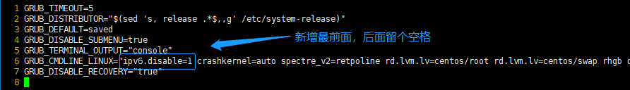GRUB_CMDLINE_LINUX="ipv6.disable=1 crashkernel=auto spectre_v2=retpoline rd.lvm.lv=centos/root rd.lvm.lv=centos/swap rhgb quiet"