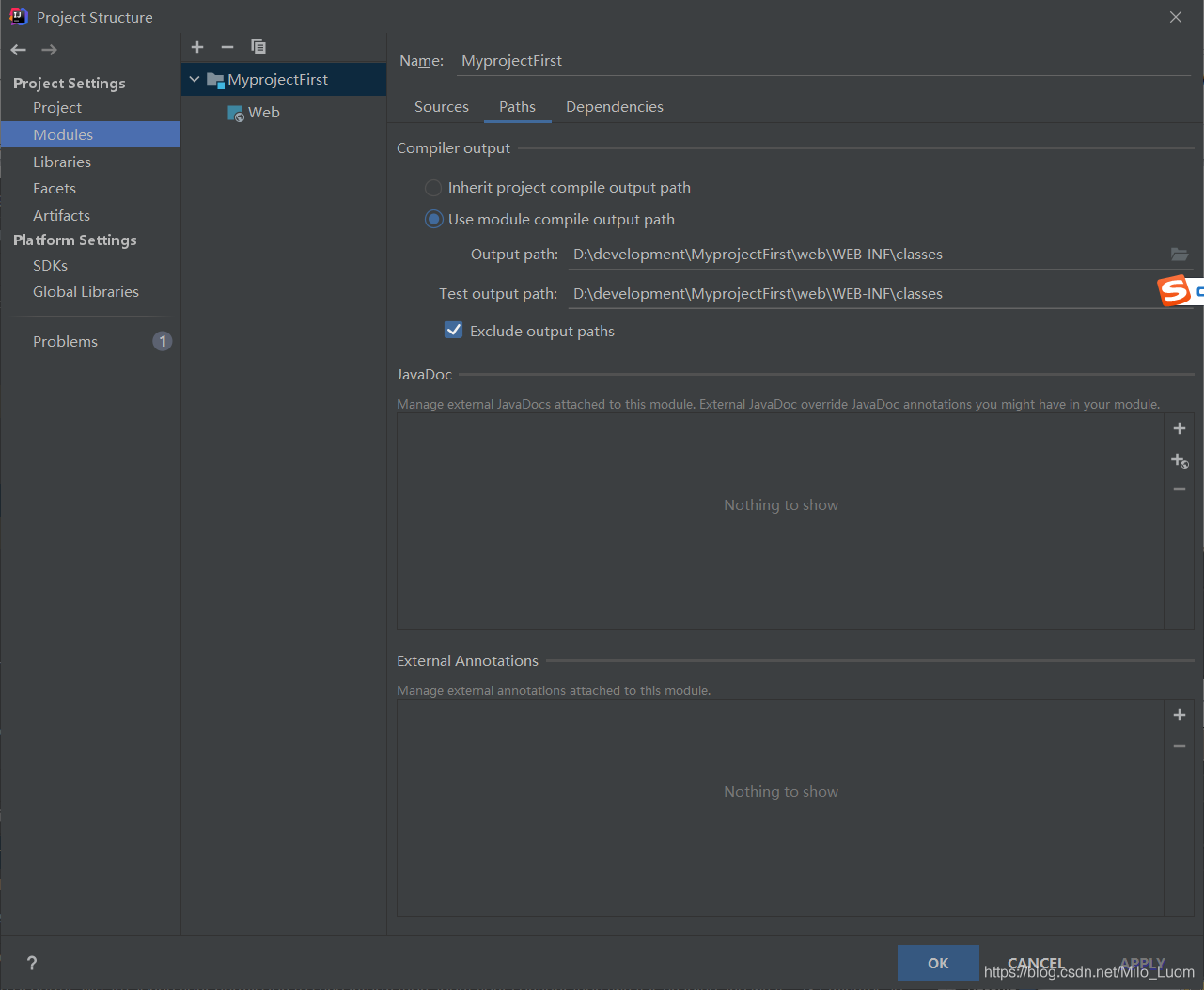 File -> Project Structure,打開以下窗口。然后選擇Modules-- Paths – 勾選“Use module compile out path” ,并將Outputpath 和Test output path 都設(shè)置為剛剛創(chuàng)建的classes文件夾