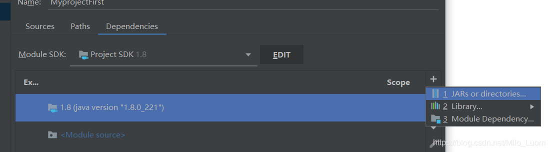 3、在當(dāng)前窗口繼續(xù)選擇Dependencies – 將Module SDK選擇為1.6,然后點(diǎn)擊右邊的 + 號(hào) – 選擇 “1 JARS or directories …”