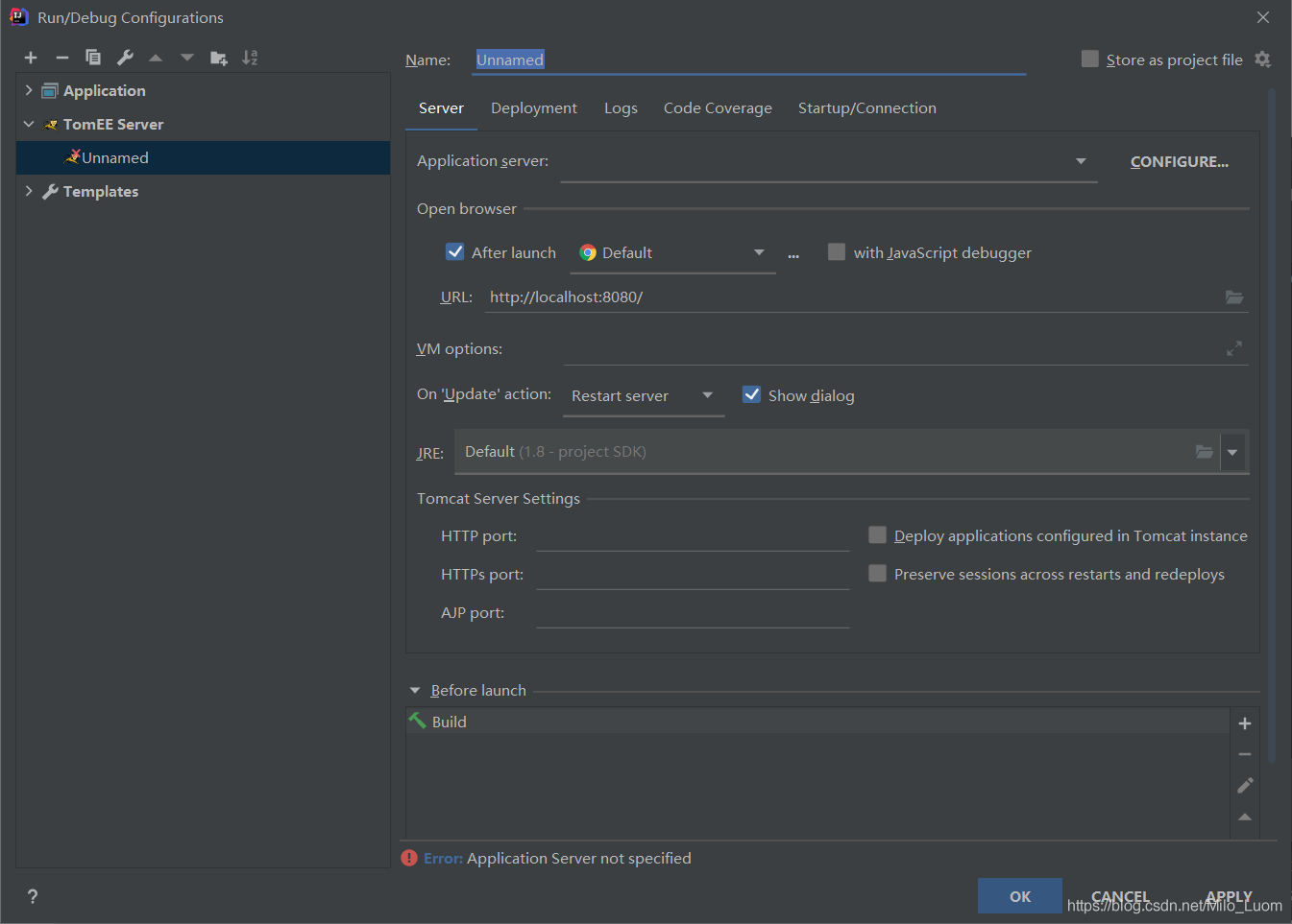 10、在"Run/Debug Configurations"窗口中Name一欄輸入服務(wù)器的名字,在“Server”面板中,勾選取消“After Launch”,設(shè)置“HTTP port”和“JMX port”(默認(rèn)值8080即可),點(diǎn)擊Apply -> OK