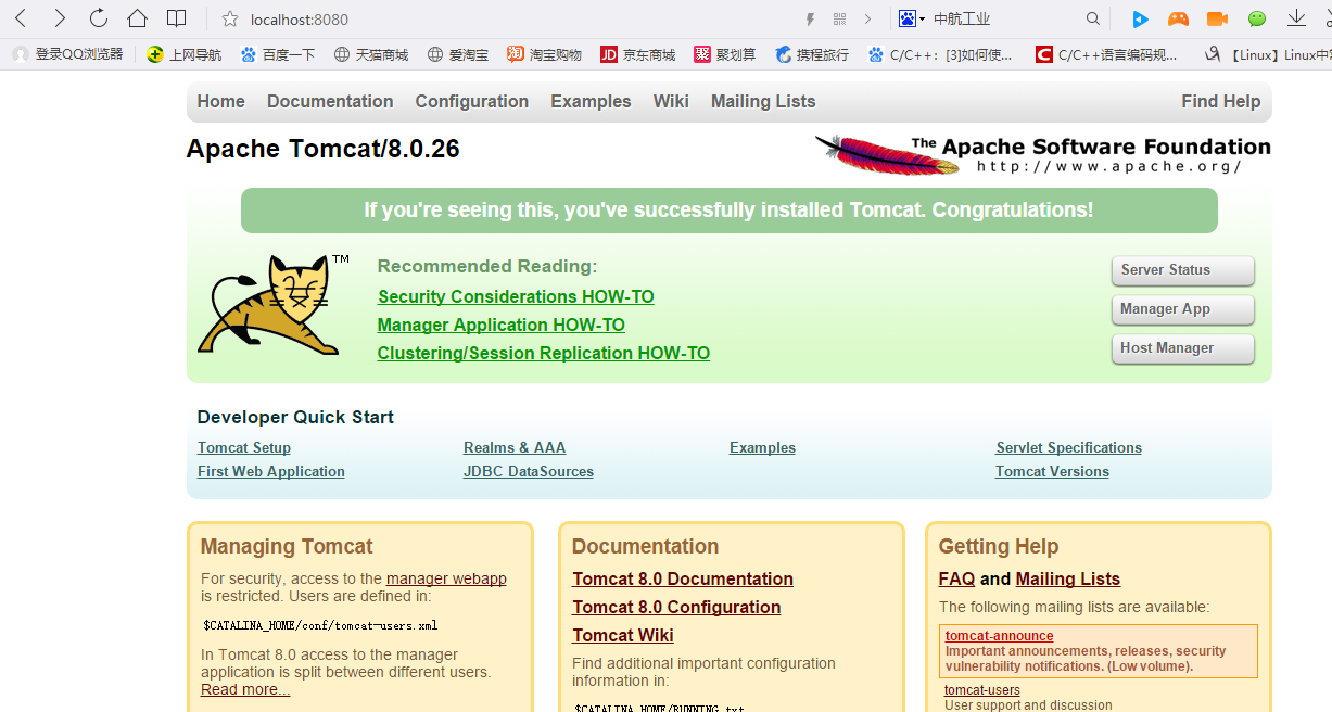 然后我再返回去重新運行Tomcat,這次不再報錯,Tomcat啟動成功!再次訪問localhost:8080,頁面成功顯示!