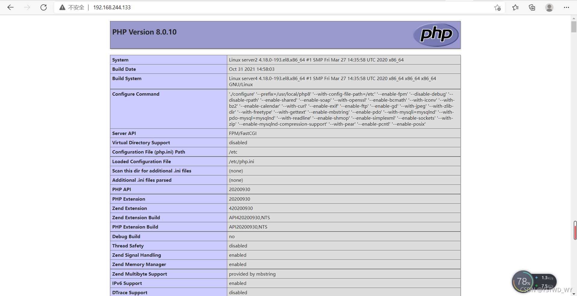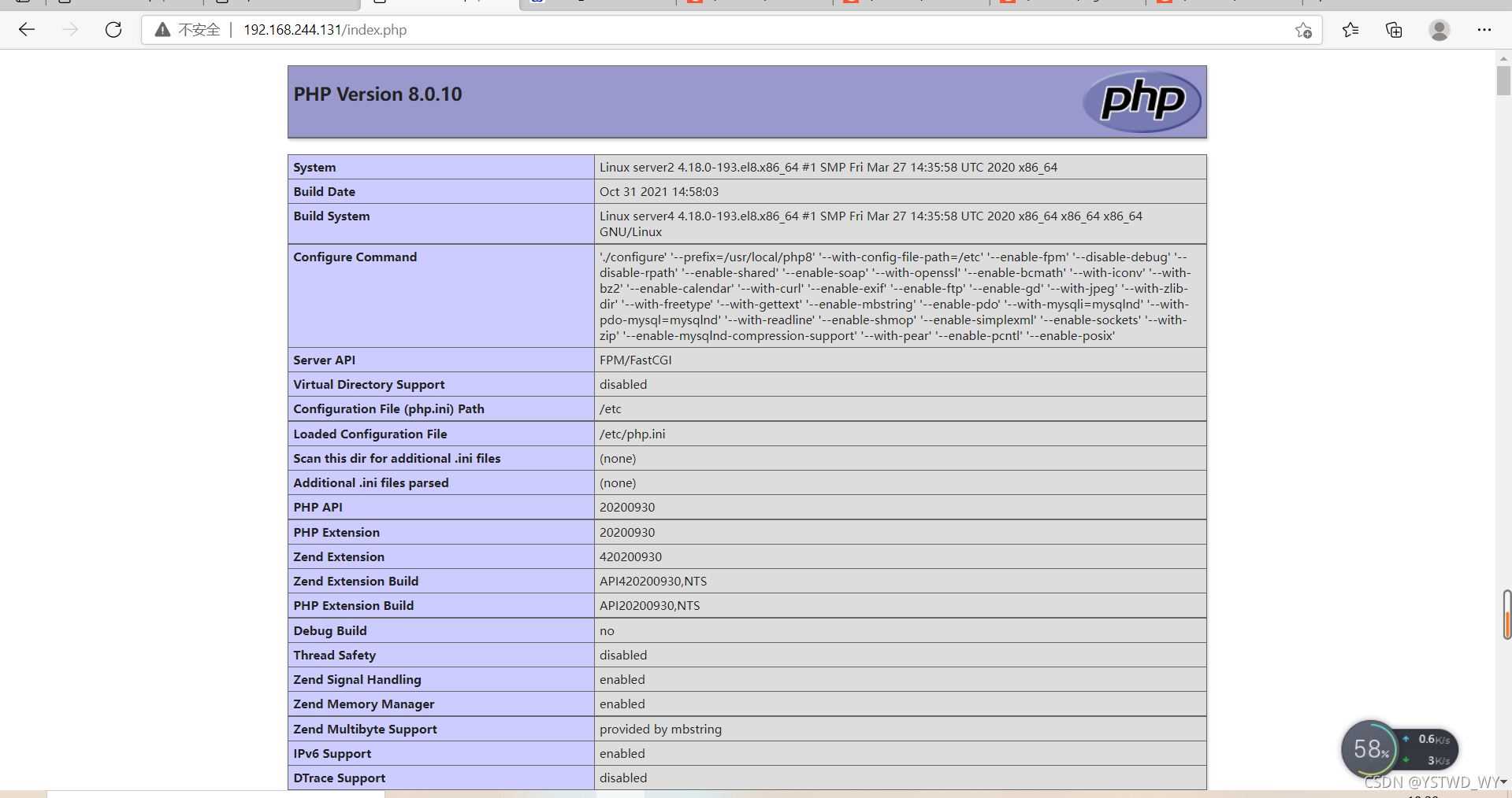 [root@server2 ~]# cd /usr/local/php-8.0.10/ [root@server2 php-8.0.10]# ./configure --prefix=/usr/local/php8 --with-config-file-path=/etc --enable-fpm --disable-debug --disable-rpath --enable-shared --enable-soap --with-openssl --enable-bcmath --with-iconv --with-bz2 --enable-calendar --with-curl --enable-exif --enable-ftp --enable-gd --with-jpeg --with-zlib-dir --with-freetype --with-gettext --enable-mbstring --enable-pdo --with-mysqli=mysqlnd --with-pdo-mysql=mysqlnd --with-readline --enable-shmop --enable-simplexml --enable-sockets --with-zip --enable-mysqlnd-compression-support --with-pear --enable-pcntl --enable-posix ...... ...... ...... config.status: creating ext/phar/phar.phar.1 config.status: creating main/php_config.h config.status: executing default commands +--------------------------------------------------------------------+ | License: | | This software is subject to the PHP License, available in this | | distribution in the file LICENSE. By continuing this installation | | process, you are bound by the terms of this license agreement. | | If you do not agree with the terms of this license, you must abort | | the installation process at this point.| +--------------------------------------------------------------------+ Thank you for using PHP. [root@server2 php-8.0.10]# make ....... ....... ....... invertedregexiterator.inc pharcommand.inc phar.inc Build complete. Don't forget to run 'make test'. [root@server2 php-8.0.10]# make install ...... ...... /root/php-8.0.10/build/shtool install -c ext/phar/phar.phar /usr/local/php8/bin/phar.phar ln -s -f phar.phar /usr/local/php8/bin/phar Installing PDO headers: /usr/local/php8/include/php/ext/pdo/