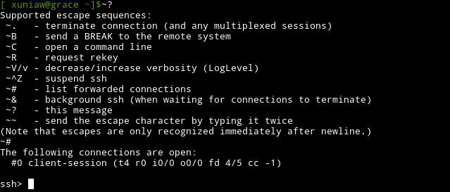 SSH 提供了多樣的轉(zhuǎn)義字符功能. 用 SSH 連接到任意一臺遠(yuǎn)程主機(jī)然后輸入 ~? 你就可以看到支持的轉(zhuǎn)義字符和功能說明列表. 以下例子展示了 ~# 和 ~C 的效果.