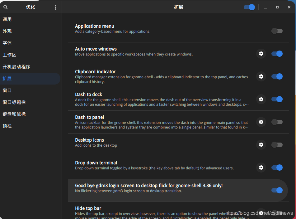 sudo apt-get install gnome-tweak-tool #優(yōu)化系統(tǒng)配置 sudo apt-get install gnome-shell-extensions sudo apt install chrome-gnome-shell # 安裝chrome 擴(kuò)展,可以直接在網(wǎng)頁(yè)安裝 sudo apt-get autoremove --purge gnome-shell-extension-Ubuntu-dock -y # 刪除自帶的dock ,不然會(huì)有沖突