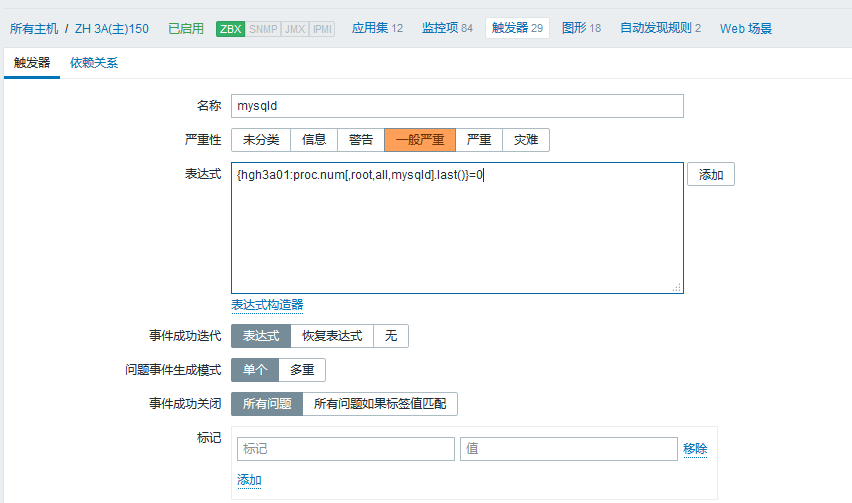 修改{hgh3a01:proc.num[,root,all,mysqld].last()}=0