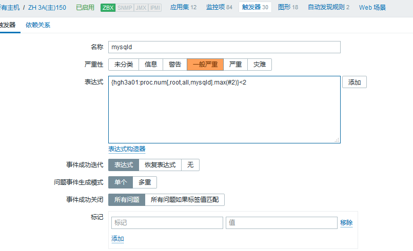 max(#2)}=2 :表示最后兩次的接收到的值都是2個(gè)進(jìn)程(ps -ef 看到 mysqld 的進(jìn)程為兩個(gè)所以=2 ),說(shuō)明mysqld進(jìn)程在運(yùn)行,則出發(fā)報(bào)警。