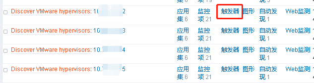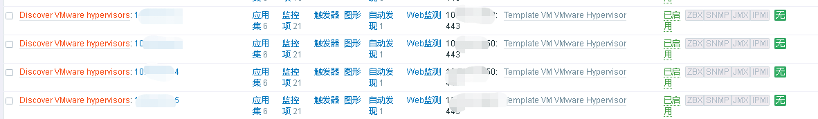 注:過一會就可以看到很多主機了,主機的添加是全自動的,依靠vcenter里面的自動發(fā)現(xiàn),如果將VMS關閉那么將無法添加虛擬化中的虛擬機,hypervisors用來發(fā)現(xiàn)添加exsi主機。根據(jù)自己的監(jiān)控內容選擇自動發(fā)現(xiàn)開啟項目,默認是全開的。