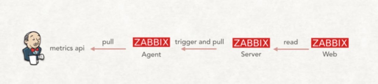 所以,我們需要在 Zabbix agent 所在機(jī)器放一個(gè)獲取 Jenkins 指標(biāo)數(shù)據(jù)的腳本。再配置 Zabbix server 定時(shí)從該 agent 獲取數(shù)據(jù),最后配置觸發(fā)器(trigger)實(shí)現(xiàn)告警。