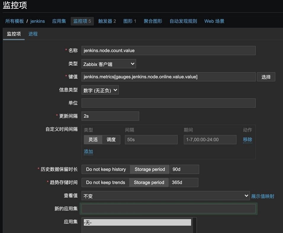 - 鍵值:由于我們要監(jiān)控的指標(biāo)并不是 Zabbix 預(yù)定義的。所以,需要使用用戶自定義參數(shù)來實(shí)現(xiàn)監(jiān)控 Jenkins 指標(biāo)。Key 填的值為:jenkins.metrics[gauges.jenkins.node.count.value.value]。jenkins.metrics是需要執(zhí)行的真正的 Key 名稱。而 [] 內(nèi)是傳給該 Key 對(duì)應(yīng)的命令的參數(shù)。對(duì)于初學(xué)者,Zabbix 這部分概念非常不好理解。也許這樣會(huì)更好理解:在使用用戶自定義參數(shù)來實(shí)現(xiàn)監(jiān)控的情況下,Zabbix server 會(huì)將這個(gè) Key 發(fā)送給 agent,然后 agent 根據(jù)這個(gè) Key 執(zhí)行指定的 邏輯 以獲取指標(biāo)數(shù)據(jù)。這個(gè) 邏輯 通常是一段腳本(shell命令或Python腳本等)。而腳本也是可以傳參的,[]中的值就是傳給腳本的參數(shù)。