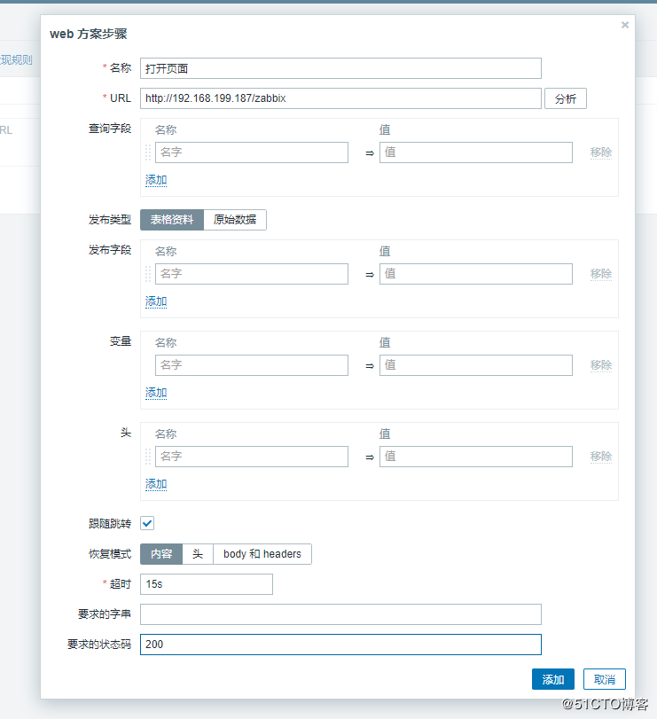 回到Web場(chǎng)景,新建一個(gè)步驟‘登陸頁面',URL填寫登陸zabbix后出現(xiàn)的鏈接,點(diǎn)擊‘原始數(shù)據(jù)',將剛才從網(wǎng)頁上獲取到的包含賬號(hào)密碼信息的字符串復(fù)制到‘原始發(fā)布'里面。勾選‘頁面跳轉(zhuǎn)',默認(rèn)15s超時(shí)時(shí)間,要求的字符可以填寫登陸頁面后看到的任意字符串,我這里寫了‘Global view',‘要求的狀態(tài)碼'同樣填‘200',最后點(diǎn)擊右下角‘添加',成功添加登陸頁面的步驟。