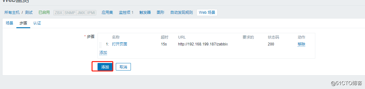 3、點(diǎn)擊‘步驟'——點(diǎn)擊‘添加',配置第一步‘打開頁面',配置如下圖所示,步驟名稱自定義,URL填寫打開zabbix時(shí)的網(wǎng)址鏈接,一般是http://IP/zabbix。