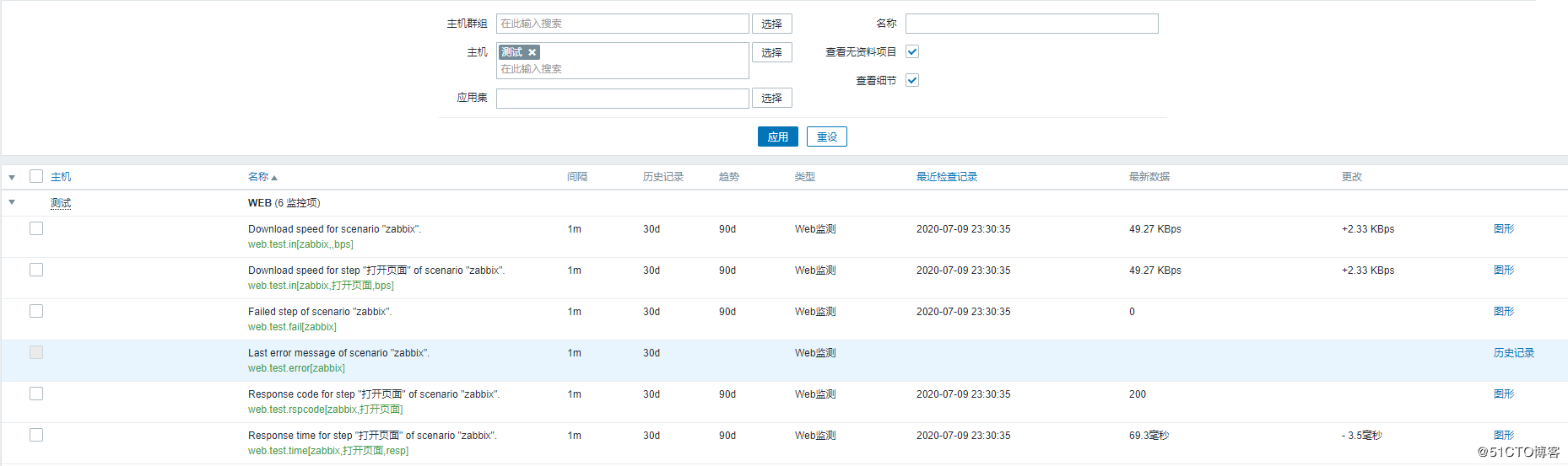 點(diǎn)擊‘監(jiān)測(cè)'——‘最新數(shù)據(jù)',選擇我們的測(cè)試機(jī),稍等一分鐘后可以看到有數(shù)據(jù),說明配置無誤。這里我們可以看到步驟‘打開頁面',返回的信息,其中從鍵值看有‘ web.test.in'(平均下載速度),‘ web.test.fail'(失敗的步驟數(shù)量),‘ web.test.error'(返回報(bào)錯(cuò)時(shí)的文本信息),‘ web.test.rspcode'(步驟的響應(yīng)代碼,例如常見的200、301、302、404、500等),‘ web.test.time'(步驟的響應(yīng)時(shí)間)