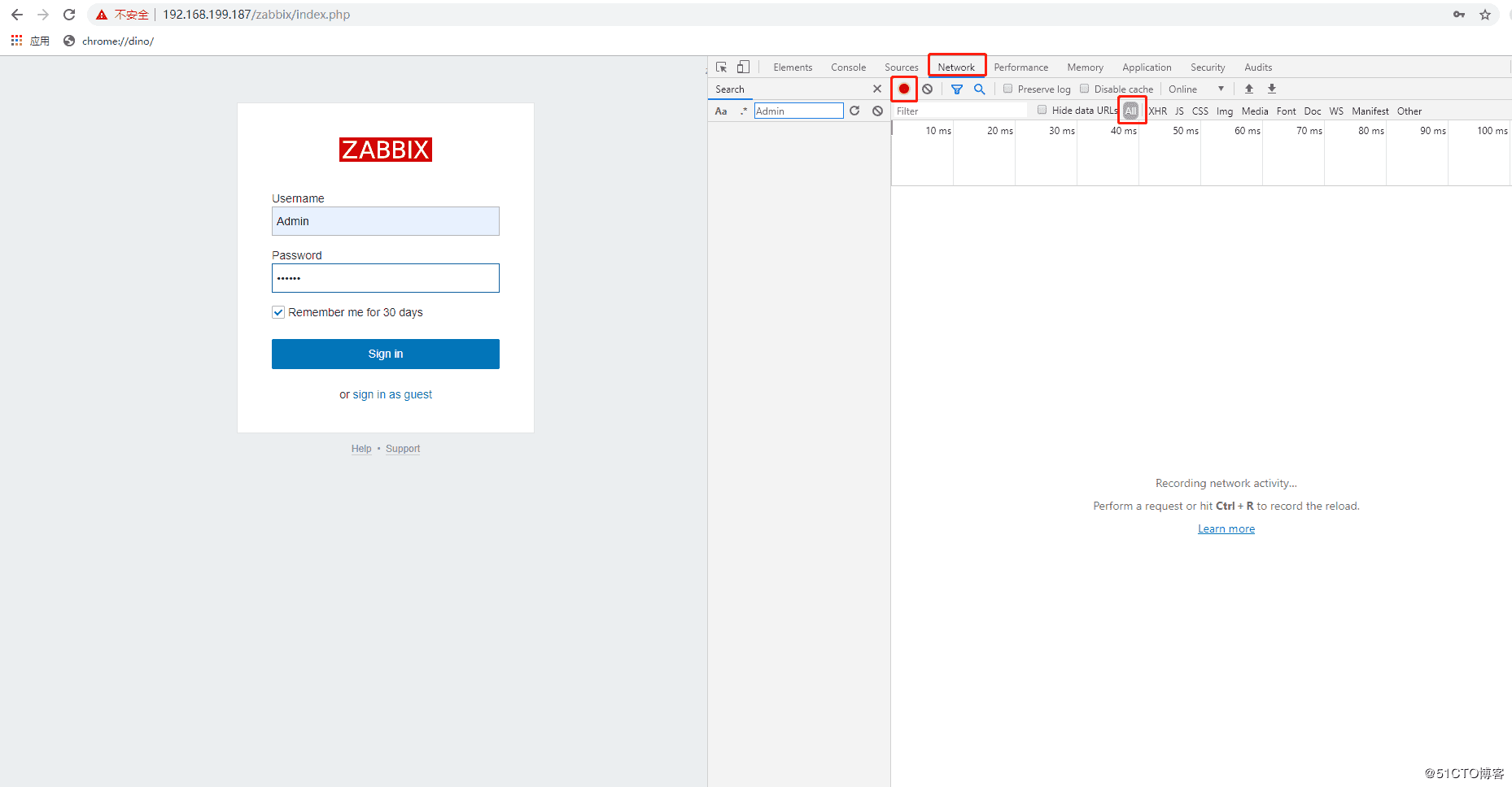 打開zabbix登陸頁面(http://IP/zabbix),按下‘F12',點(diǎn)擊‘Network',紅色小圓圈表示開啟網(wǎng)絡(luò)日志分析,頁面資源這里我選擇All,不同的web需要具體分析合適的資源。