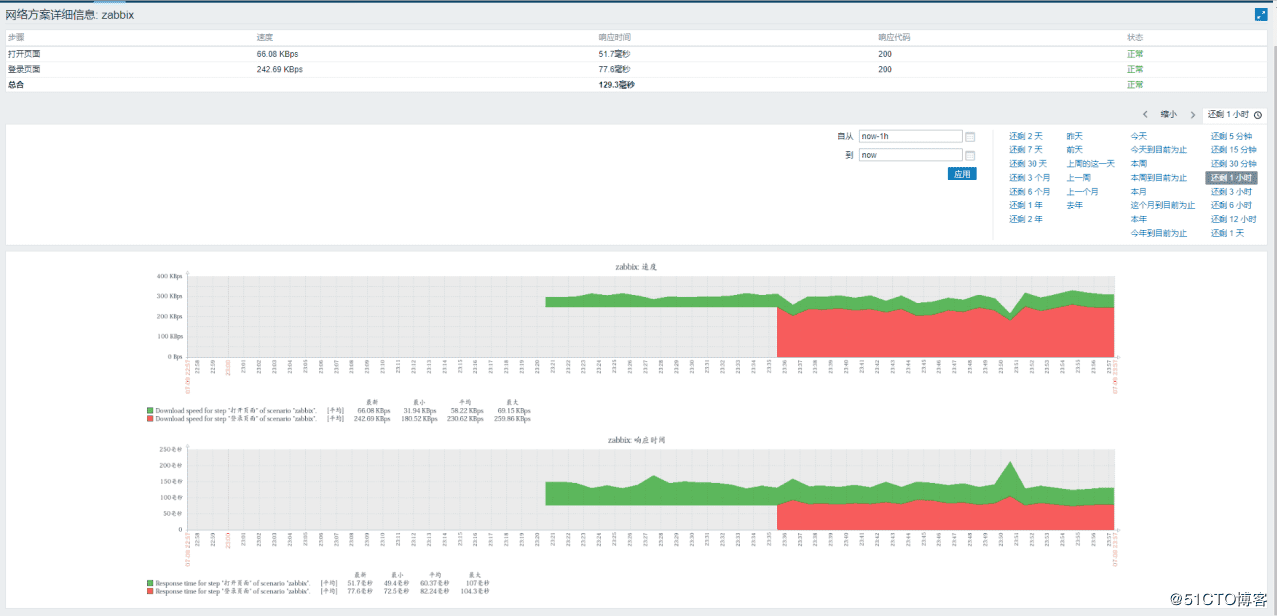 5、點(diǎn)擊‘監(jiān)測(cè)'——‘WEB監(jiān)測(cè)',可以看到我們配置了WEB監(jiān)測(cè)的主機(jī),點(diǎn)擊WEB場(chǎng)景的名稱(這里是zabbix),可以看到以圖表方式展示的WEB監(jiān)測(cè)數(shù)據(jù)。