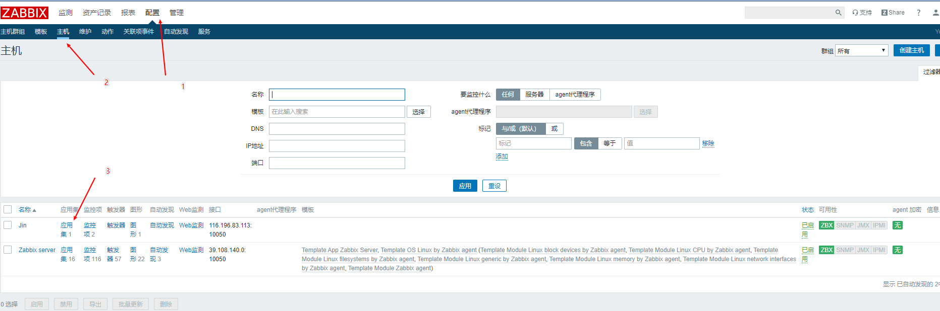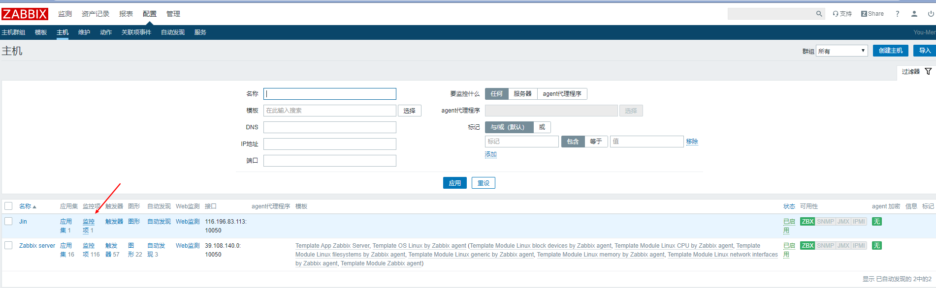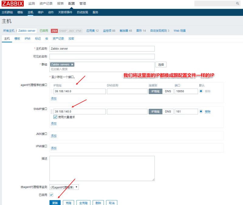 接下來(lái)我們到web界面上配置如何監(jiān)控本地主機(jī),我們看到接口上是127.0.0.1,但是我們配置文件寫(xiě)的是39.108.140.0,我們讓這兩個(gè)IP一致.點(diǎn)擊3進(jìn)去然后修改.