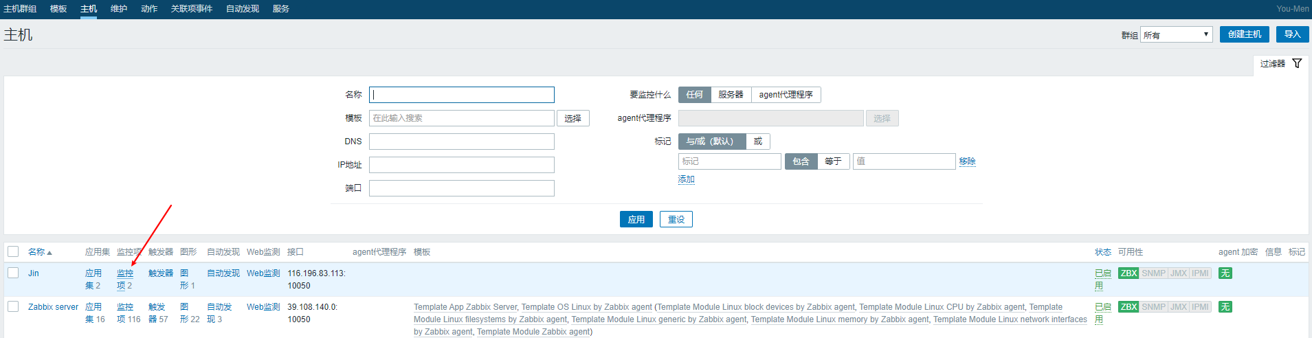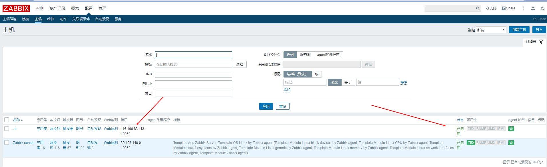 vim /etc/zabbix/zabbix_agentd.conf Server=39.108.140.0 # 被動(dòng)模式 zabbix-server-ip ServerActive=39.108.140.0 # 主動(dòng)模式 zabbix-server-ip Hostname=You-Men # Agent端主機(jī)名,最終顯示在監(jiān)控頁(yè)面上的名字 UnsafeUserParameters=1 # 是否限制用戶自定義keys使用特殊字符 systemctl restart zabbix-agent netstat -antp|grep agent tcp 0 0 0.0.0.0:10050 0.0.0.0:* LISTEN 3898/zabbix_agentd tcp6 0 0 :::10050 :::* LISTEN 3898/zabbix_agentd