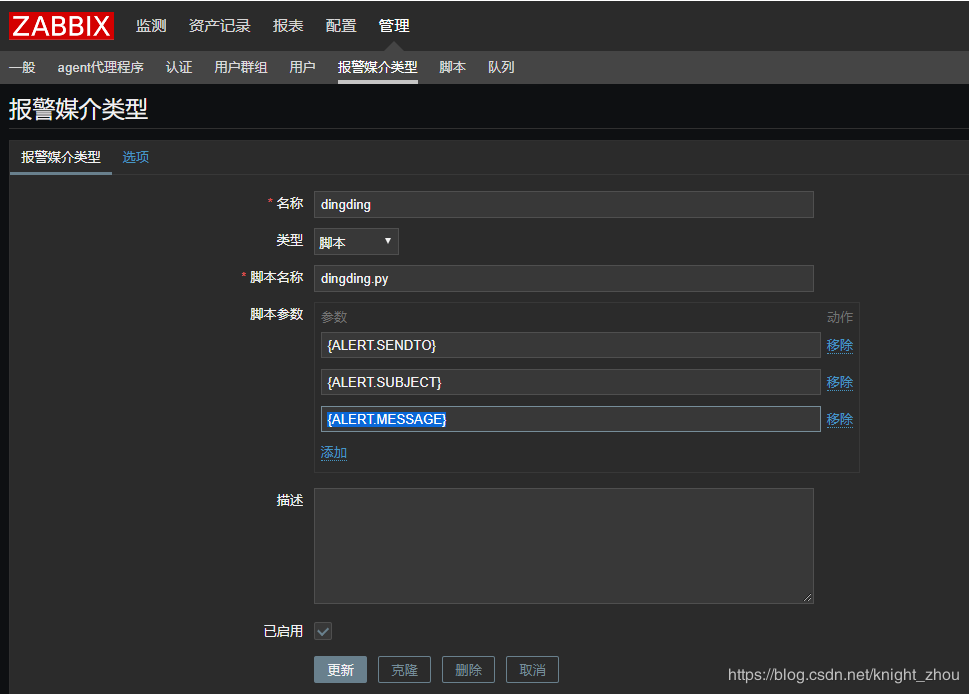 配置---> 報(bào)警媒介類型,腳本參數(shù)如下: