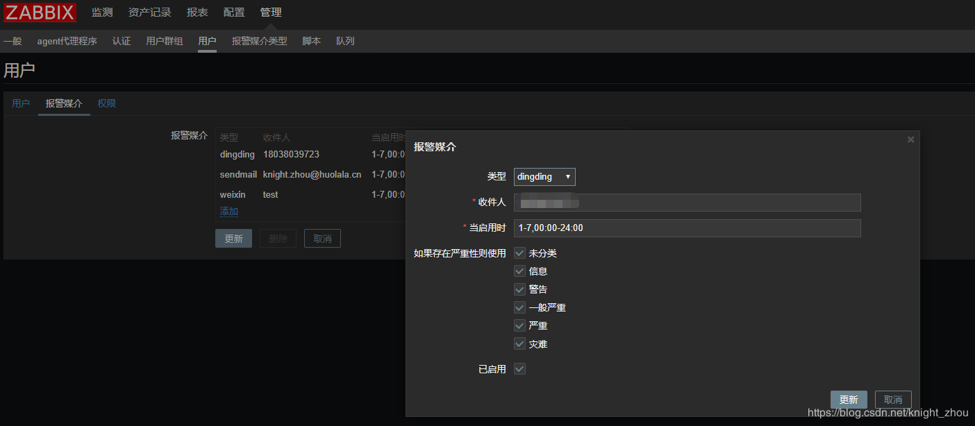 配置--->用戶---> 報(bào)警媒介,把釘釘加進(jìn)來即可。 其中收件人要寫自己的電話號(hào)碼。