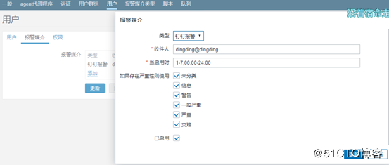 打開管理中的用戶,點擊需要設(shè)置郵件告警的用戶,然后在報警媒介中添加報警媒介,在彈框中選擇剛才定義的類型,收件人自定義,最后添加