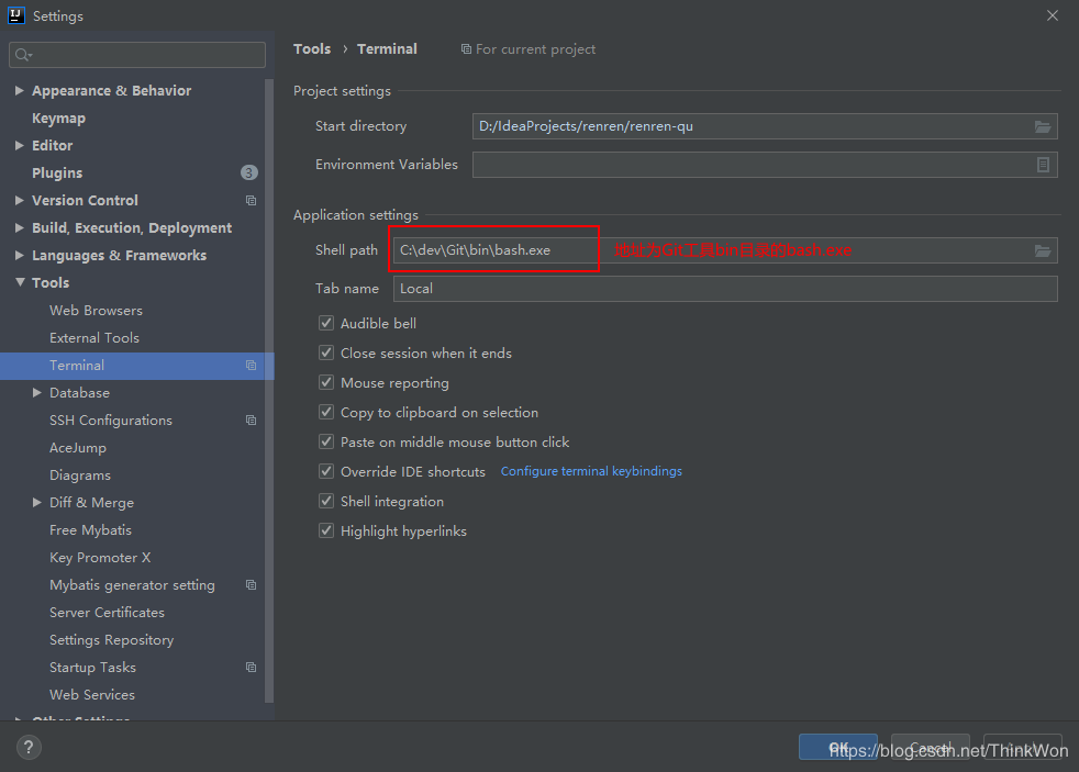 setting -> Tools -> Terminal,在Shell path 選項(xiàng)中選擇Git工具bin目錄的bash.exe