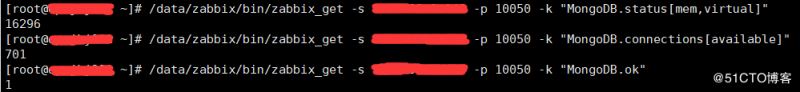/data/zabbix/bin/zabbix_get -s xxx.xxx.xxx.xxx -p 10050 -k "MongoDB.status[mem,virtual]" /data/zabbix/bin/zabbix_get -s xxx.xxx.xxx.xxx -p 10050 -k "MongoDB.connections[available]" /data/zabbix/bin/zabbix_get -s xxx.xxx.xxx.xxx -p 10050 -k "MongoDB.ok"