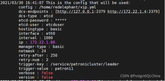 3、啟動vip-manager,通過訪問etcd集群中/ S E R V I C E N A M E / {SERVICE_NAME}/ SERVICENAME/{CLUSTER_NAME}/leader鍵中的具體值,判斷當前節(jié)點是否為主節(jié)點ip,如果是則為該節(jié)點設置vip,提供對外讀寫服務。