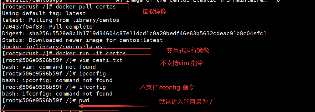 docker pull centos # 拉取鏡像docker run -it centos #運(yùn)行鏡像# ===== 測(cè)試====vim ceshi.txtifconfig pwd