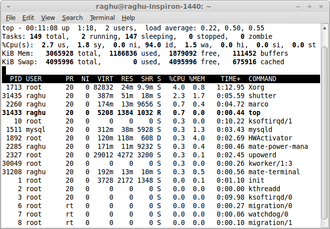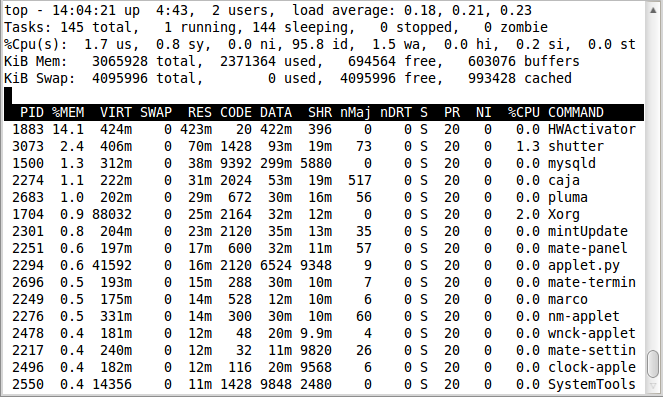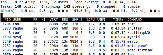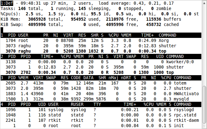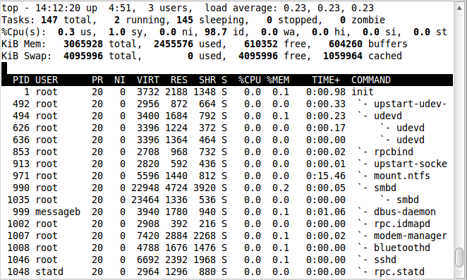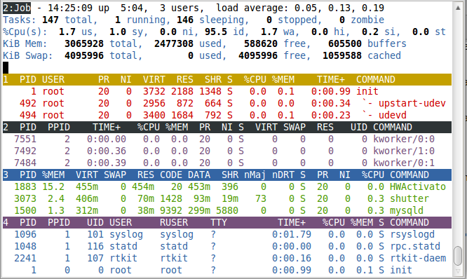 前幾行水平顯示了不同系統(tǒng)參數(shù)的概括,接下來是進(jìn)程和它們在列中的屬性。