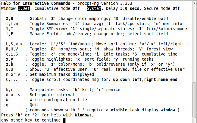 切換高亮信息:'x'將排序字段高亮顯示(縱列);'y'將運行進(jìn)程高亮顯示(橫行)。依賴于你的顯示設(shè)置,你可能需要讓輸出彩色來看到這些高亮。