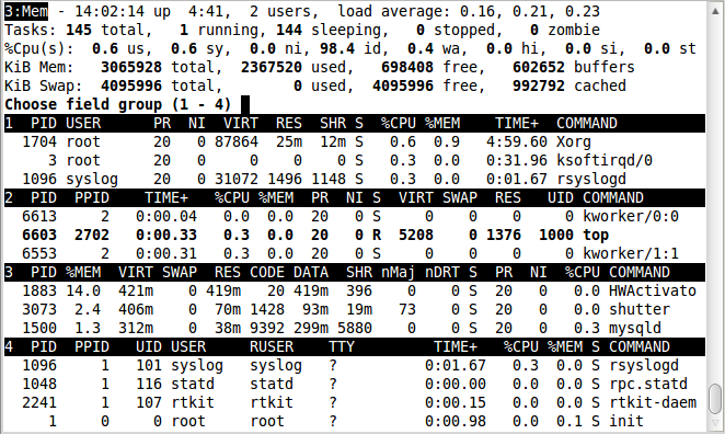 這個命令在全屏和交替模式間切換。在交替模式下會顯示4個窗口(譯注:分別關(guān)注不同的字段):