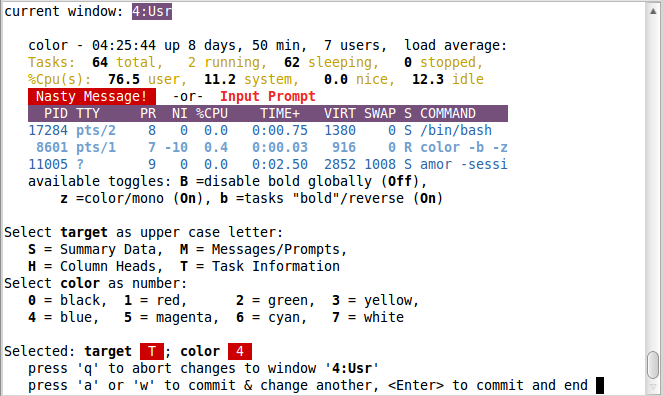 按下'Z'向用戶顯示一個改變top命令的輸出顏色的屏幕??梢詾?個任務(wù)區(qū)域選擇8種顏色。