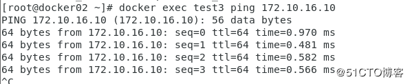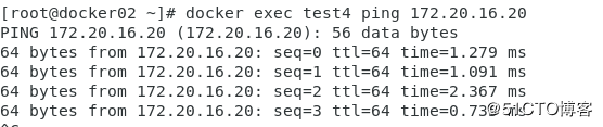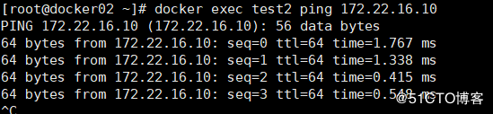 使用第二臺(tái)docker服務(wù)器上的容器test2對(duì)第一臺(tái)docker服務(wù)器上的容器test1進(jìn)行ping測(cè)試