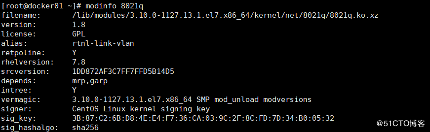[root@docker02 ~]# ip link set ens33 promisc on # 開啟混雜模式 [root@docker02 ~]# ip link show ens33 2: ens33: <BROADCAST,MULTICAST,'PROMISC',UP,LOWER_UP> mtu 1500 qdisc pfifo_fast state UP mode DEFAULT group default qlen 1000 link/ether 00:0c:29:b5:bc:ed brd ff:ff:ff:ff:ff:ff [root@docker02 ~]# modinfo 8021q 返回信息可參考圖一