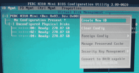 3. 此時(shí)虛擬磁盤為空,按上下鍵使光標(biāo)停留在陣列卡型號所在行(圖中的PERC H310 Mini),按F2彈出菜單,選擇Create New VD創(chuàng)建新的虛擬磁盤,如圖2-3所示: