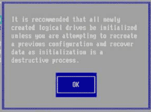 7. 上述的配置確認(rèn)完成后,按Tab鍵,將光標(biāo)移至OK處,按回車,會出現(xiàn)如下的提示,如果是一個(gè)全新的陣列,建議進(jìn)行初始化操作,如果配置陣列的目的是為了恢復(fù)之前的數(shù)據(jù),則不要進(jìn)行初始化。按回車確認(rèn)即可繼續(xù)。