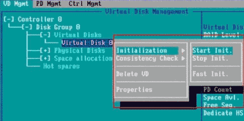 9. 使用上下方向鍵將光標(biāo)調(diào)至新建的虛擬磁盤上,按F2彈出菜單,可以對剛才配置成功的虛擬磁盤(Virtual Disk 0)進(jìn)行初始化(Initialization),一致性校驗(yàn)(Consistency Check),刪除,查看屬性等操作。此處我們執(zhí)行初始化操作。如圖2-8所示:
