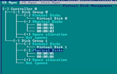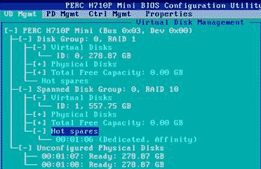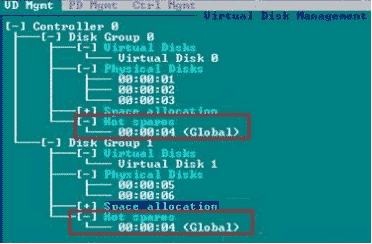 3) 確認(rèn)選擇后,剛剛選擇的硬盤的狀態(tài)變?yōu)镠otspare,熱備盤配置完成,返回VD Mgnt,可以看到兩個(gè)RAID的熱備盤是同一個(gè)硬盤。全局熱備配置完成。