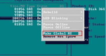 2) 可看到已配置RAID的硬盤狀態(tài)為Online,而未配置的硬盤狀態(tài)為Ready,將光標(biāo)移動(dòng)至想要配置為熱備盤的物理盤(硬盤狀態(tài)必須為Ready),按F2彈出菜單,選擇Make Global HS。