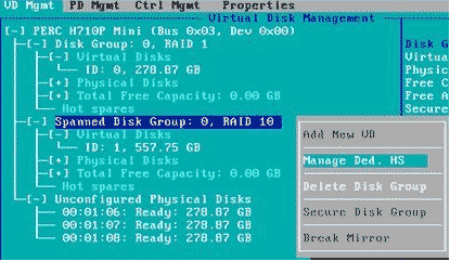 2) 按上下方向鍵高亮選中RAID10組(Spanned Disk Group:0),按F2,在彈出菜單里選擇Mange Ded. HS。如圖3-6所示: