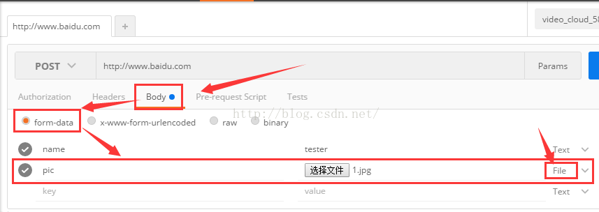上面的樣例是post方式傳輸普通參數(shù),如果我們需要發(fā)送帶文件的請(qǐng)求時(shí),就要改下請(qǐng)求格式了,具體如下: