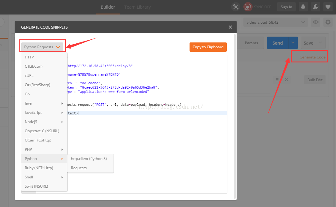 POSTMAN還有一個(gè)很贊的地方就是導(dǎo)出用例為CODE,即如果你編寫(xiě)好了用例之后可以通過(guò)點(diǎn)擊“Generate Code”來(lái)一鍵生成代碼,并且還有好多語(yǔ)言和類庫(kù)可以選擇,幀的是棒棒噠!