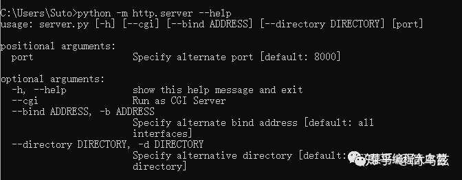 在Python3.7中,http.server提供了5種參數(shù),調(diào)用下面幫助命令可顯示如下:python -m http.server --help