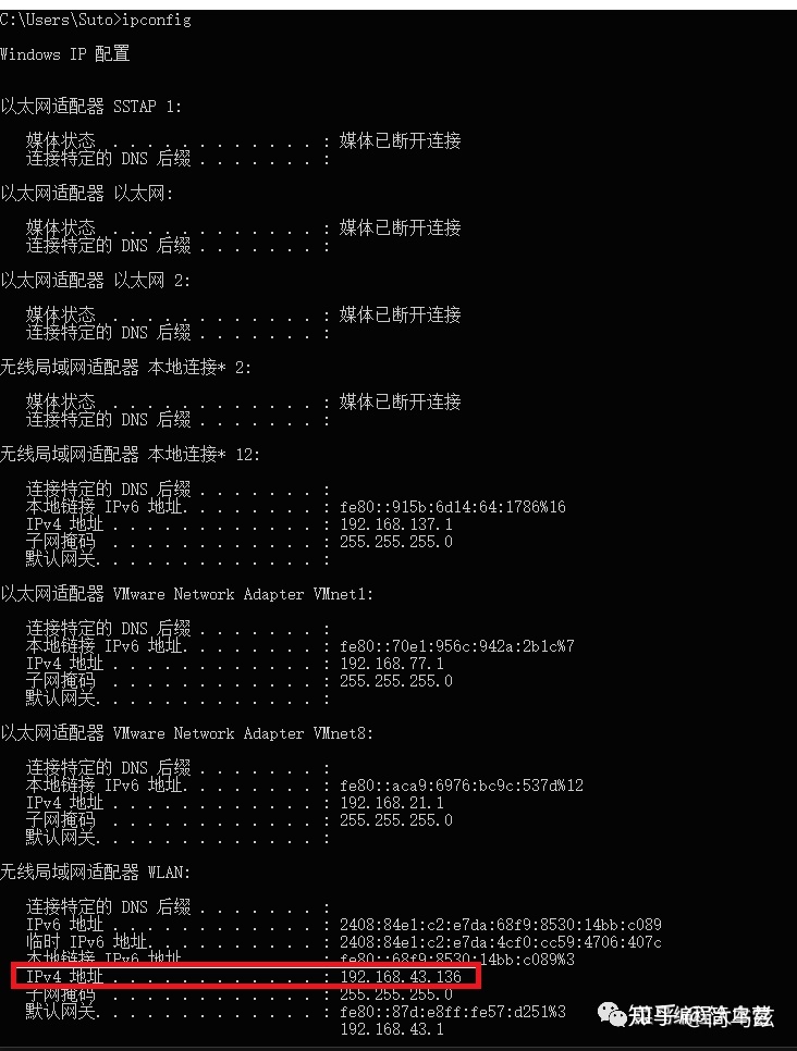 Windows平臺可以通過ipconfig(Linux平臺通過ifconfig -a )獲取IP,注意選用的是無線局域網(wǎng)適配器WLAN中的IPv4地址。