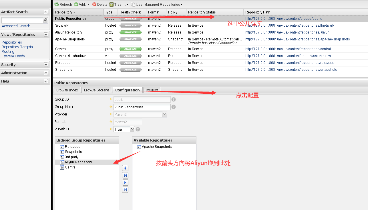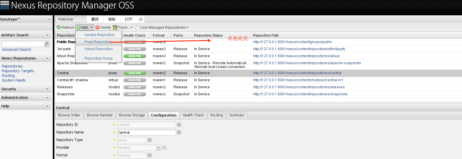 搭建Nexus默認central倉庫為maven的,maven是外國網(wǎng)站,慢死了。這里為大家添加阿里云代理倉庫