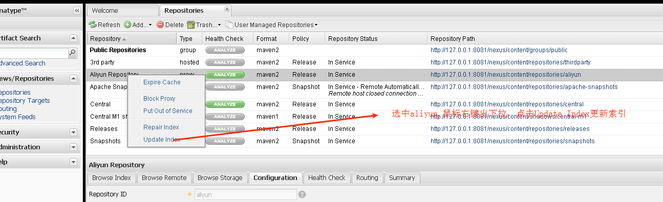 索引包較大,建議網(wǎng)上下載離線版后放入\nexus\sonatype-work\nexus\indexer\aliyun-ctx