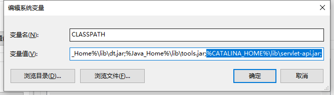 變量值:%CATALINA_HOME%\lib\servlet-api.jar; (注意加的時候在原變量值后加英文“;”)