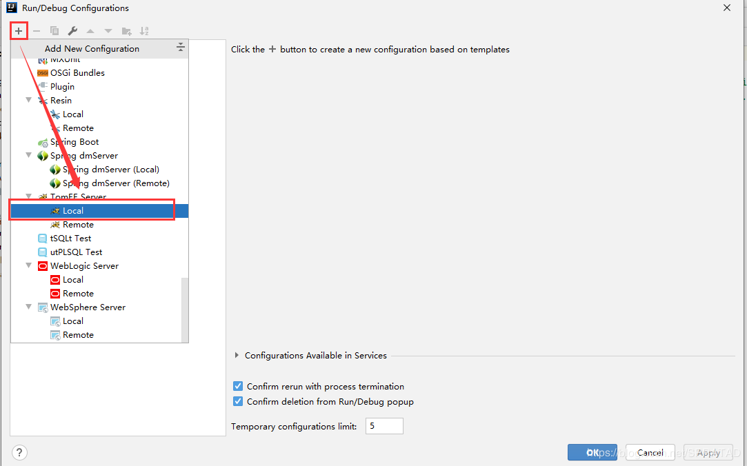 點擊左側(cè)“+”,選擇Tomcat Server–Local(這里有點錯誤 應(yīng)該是選Tomcat 我選成了TomEE ),