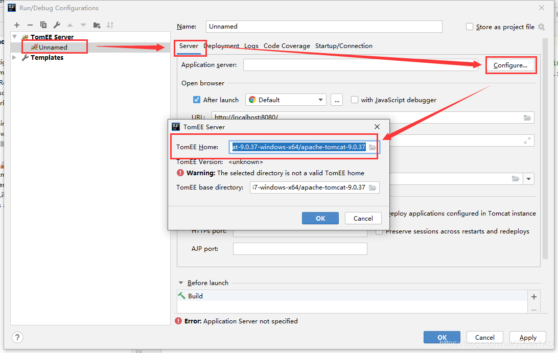 在Tomcat Server -> Unnamed -> Server -> Application server項目下,點擊 Configuration ,找到本地 Tomcat 服務(wù)器,再點擊 OK按鈕。(這里有點錯誤 應(yīng)該是選Tomcat 我選成了TomEE )