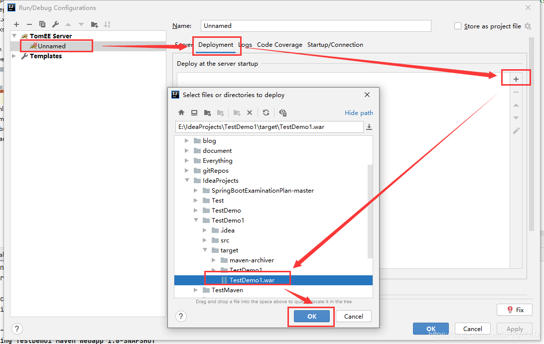 此處選擇TestDemo.war作為部署包。 (這里有點錯誤 應(yīng)該是選Tomcat 我選成了TomEE )