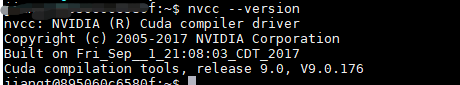 #在切換cuda版本時(shí) rm -rf /usr/local/cuda#刪除之前創(chuàng)建的軟鏈接 sudo ln -s /usr/local/cuda-8.0 /usr/local/cuda nvcc --version #查看當(dāng)前 cuda 版本 nvcc: NVIDIA (R) Cuda compiler driver Copyright (c) 2005-2016 NVIDIA Corporation Built on Mon_Jan_23_12:24:11_CST_2017 Cuda compilation tools, release 8.0, V8.0.62 #cuda8.0 切換到 cuda9.0 rm -rf /usr/local/cuda sudo ln -s /usr/local/cuda-9.0 /usr/local/cuda nvcc --version